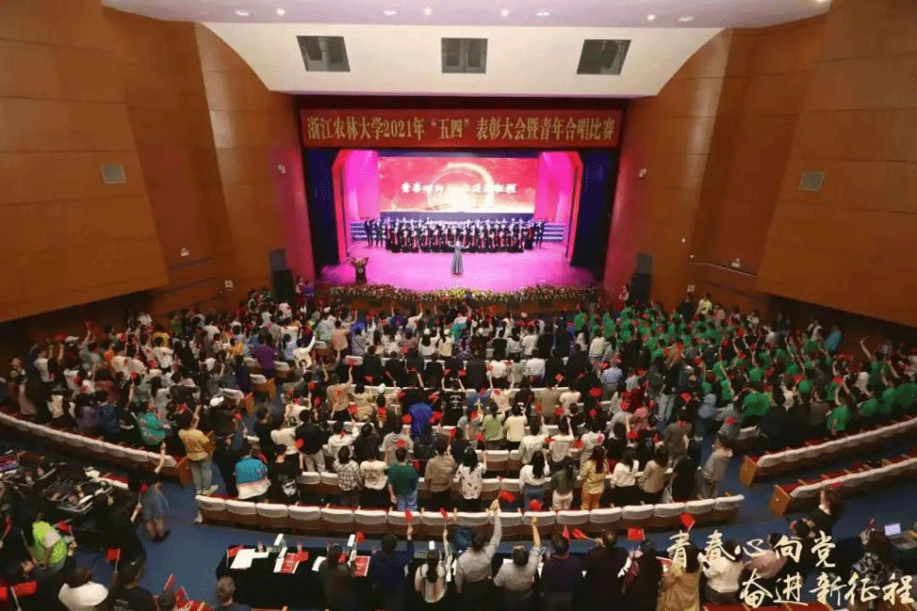 4月29日,学校在东湖校区影剧院举行2021年“五四”表彰大会暨青年合唱比赛。校党政领导班子成员沈满洪、沈希、冯尚申、施美红、沈月琴、胡祖吉、吴家胜、徐爱俊、包松永、缪鲁加、倪建均出席表彰大会并为获奖代表颁奖。